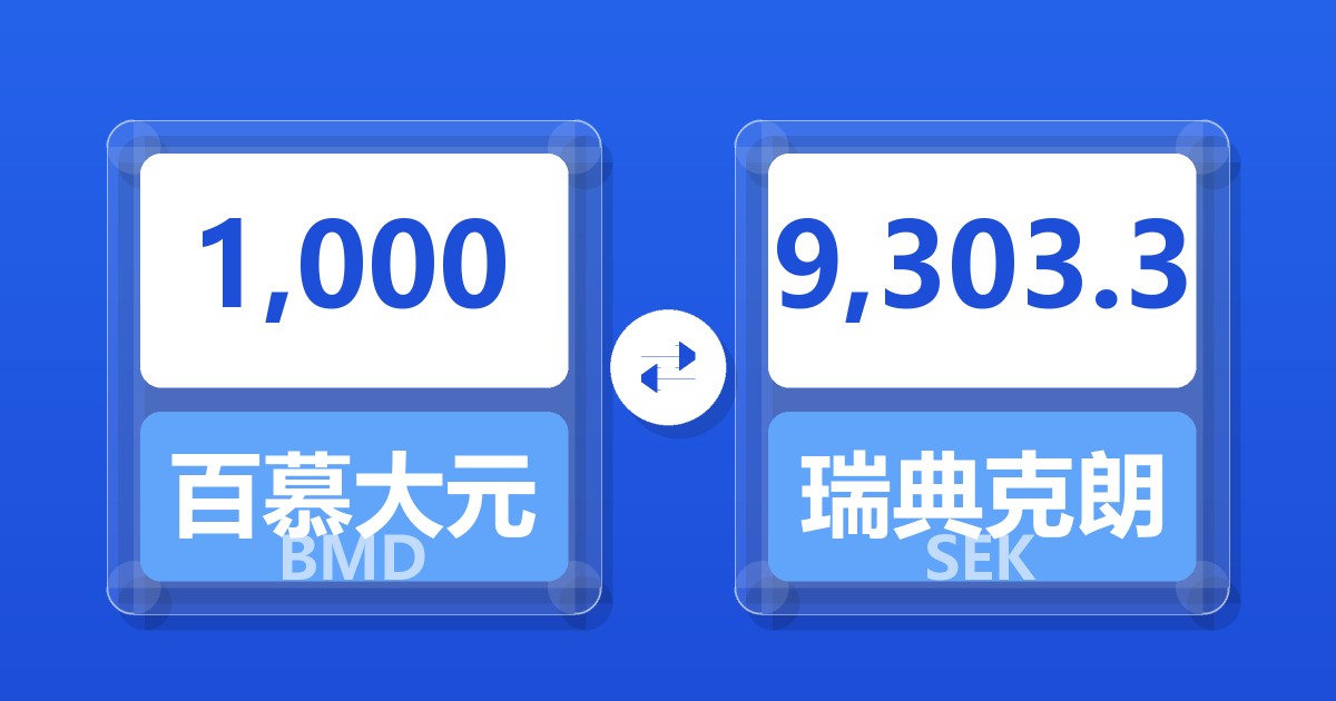 1,000 百慕大元 (BMD) = 9,303.30 瑞典克朗 (SEK)