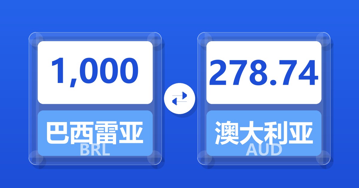 1,000 巴西雷亚尔 (BRL) = 278.17 澳大利亚元 (AUD)