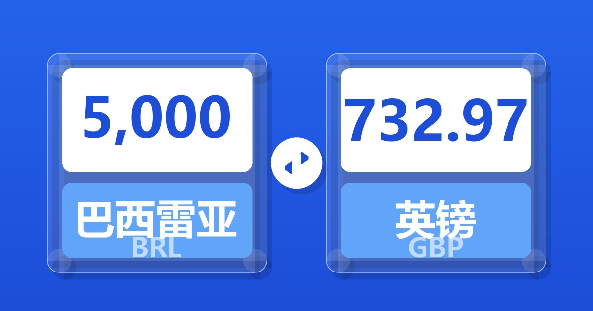 5,000 巴西雷亚尔 (BRL) = 730.41 英镑 (GBP)