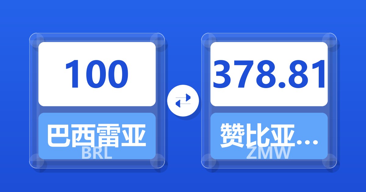 100 巴西雷亚尔 (BRL) = 378.38 赞比亚克瓦查 (ZMW)