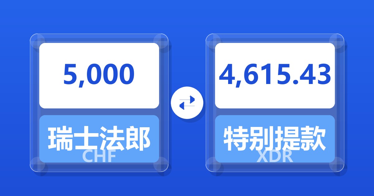 5,000 瑞士法郎 (CHF) = 4,615.43 特别提款权 (XDR)