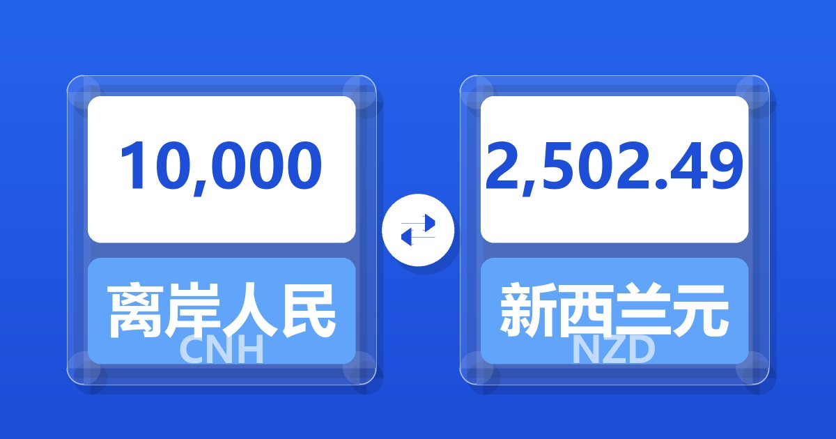 10,000 离岸人民币 (CNH) = 2,512.30 新西兰元 (NZD)