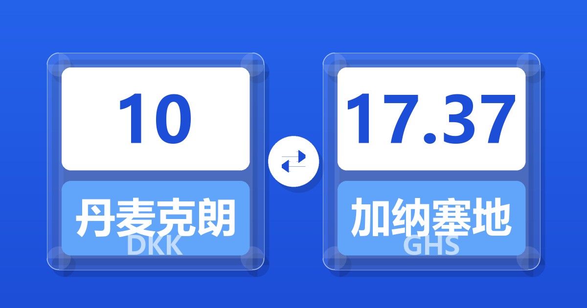 10 丹麦克朗 (DKK) = 17.34 加纳塞地 (GHS)