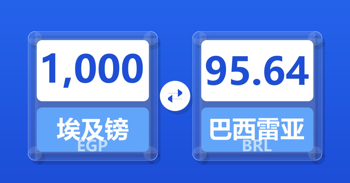 1,000 埃及镑 (EGP) = 95.70 巴西雷亚尔 (BRL)