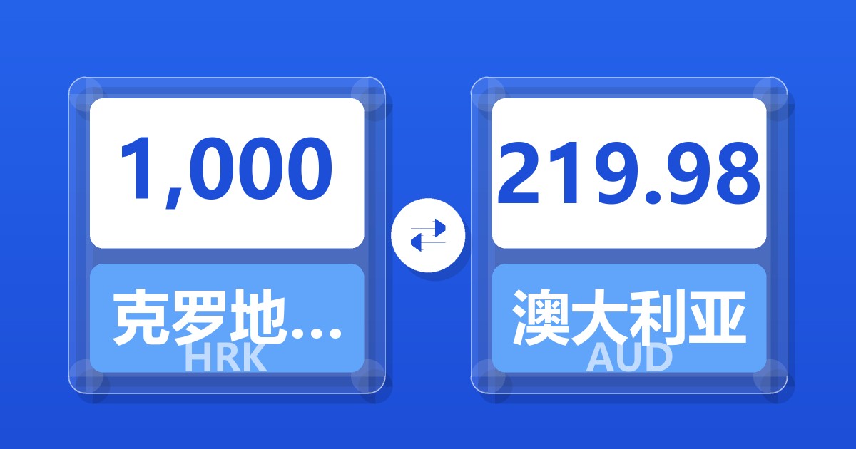 1,000 克罗地亚库纳 (HRK) = 219.98 澳大利亚元 (AUD)