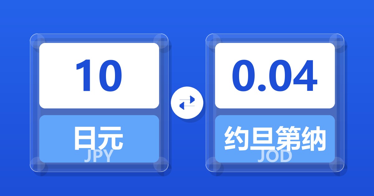 10 日元 (JPY) = 0.04 约旦第纳尔 (JOD)