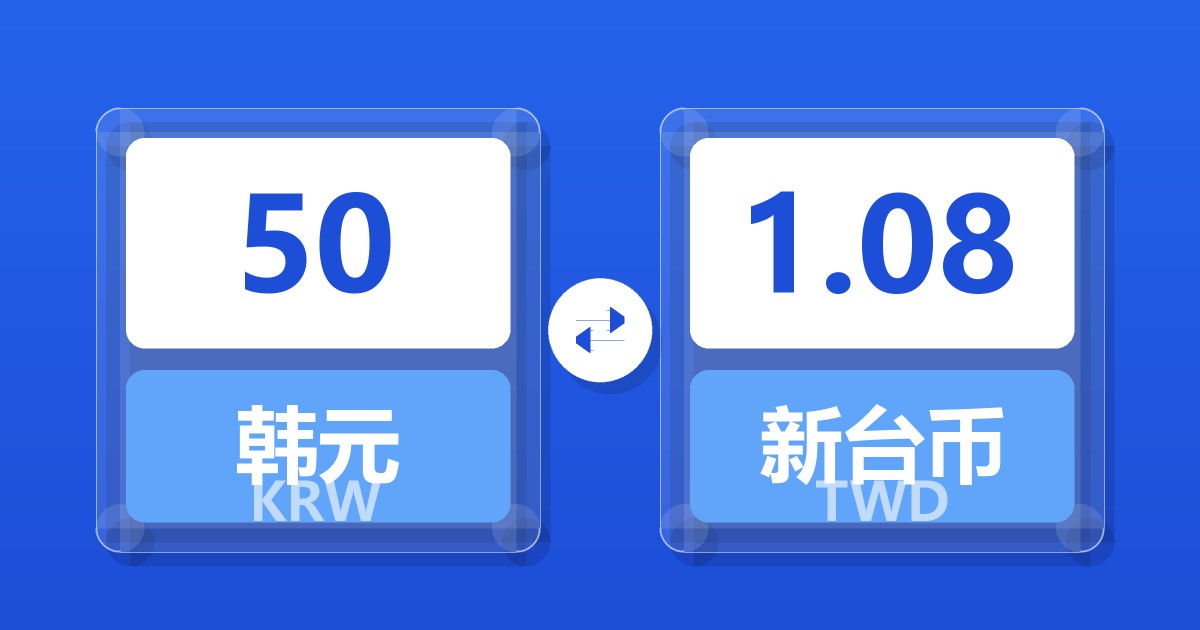 50 韩元 (KRW) = 1.07 新台币 (TWD)