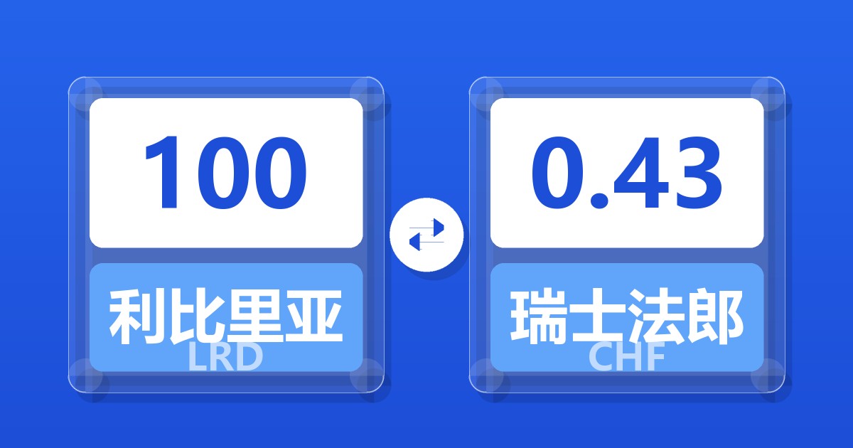 100 利比里亚元 (LRD) = 0.43 瑞士法郎 (CHF)