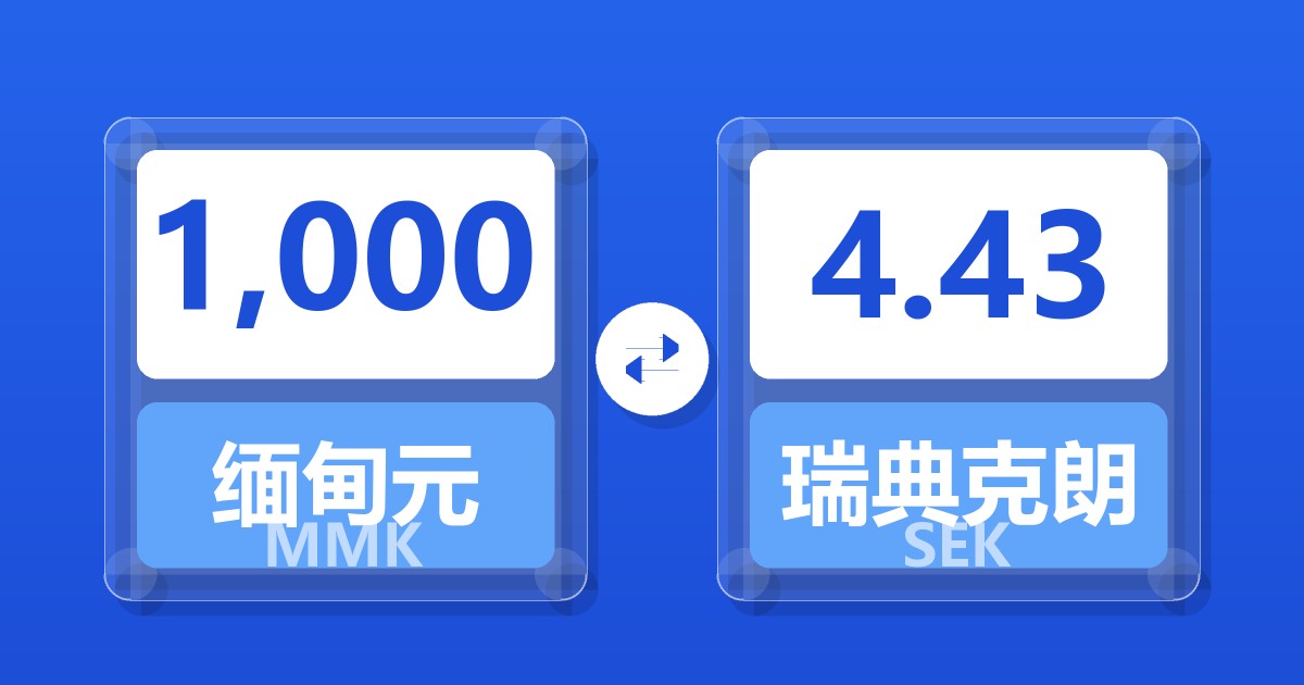 1,000 缅甸元 (MMK) = 4.43 瑞典克朗 (SEK)
