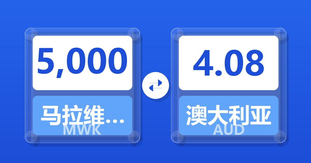 5,000 马拉维克瓦查 (MWK) = 4.08 澳大利亚元 (AUD)