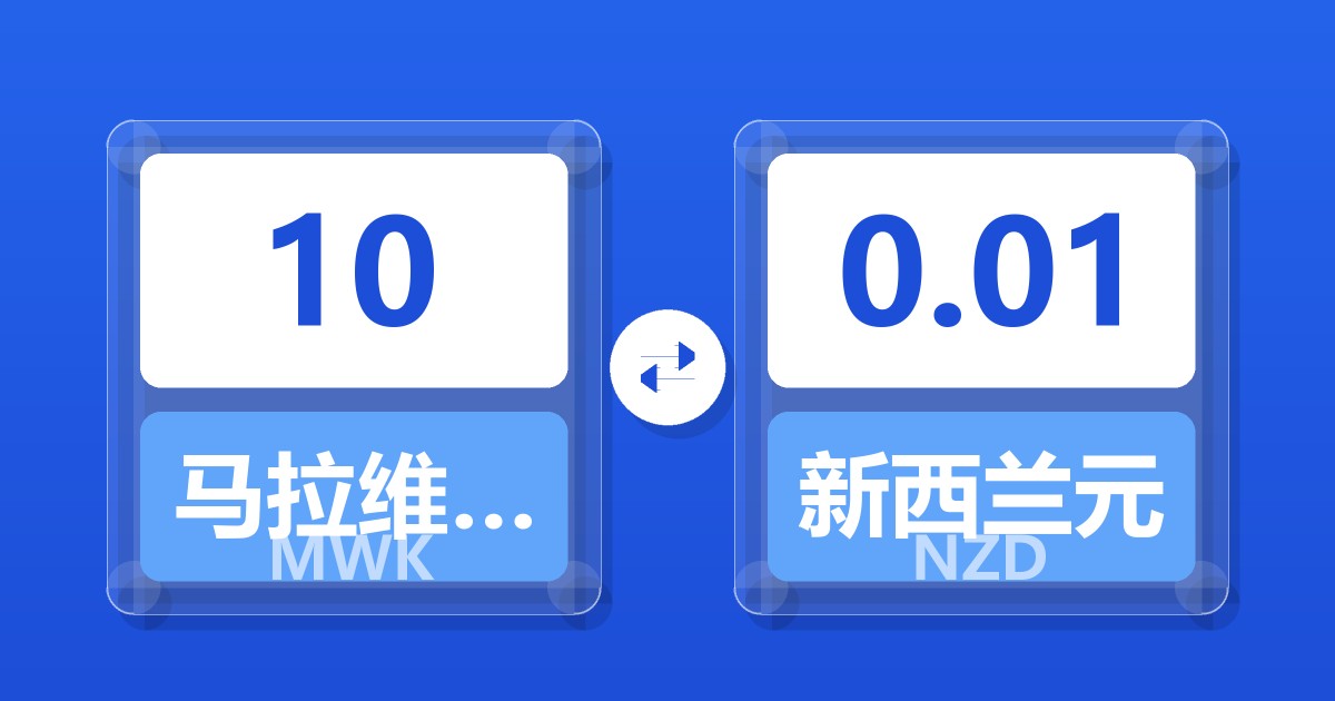 10 马拉维克瓦查 (MWK) = 0.01 新西兰元 (NZD)