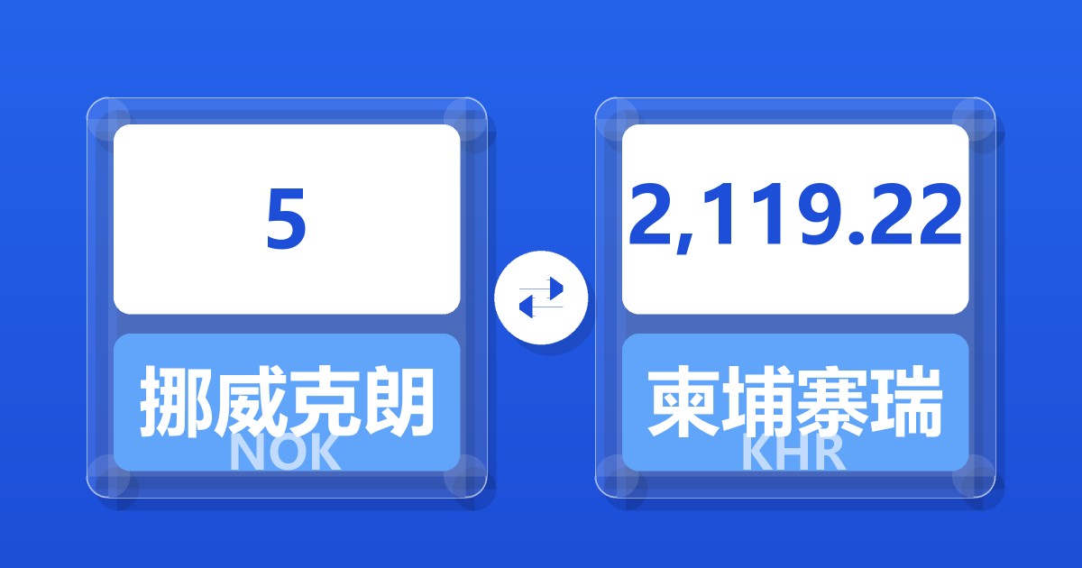 5 挪威克朗 (NOK) = 2,105.29 柬埔寨瑞尔 (KHR)