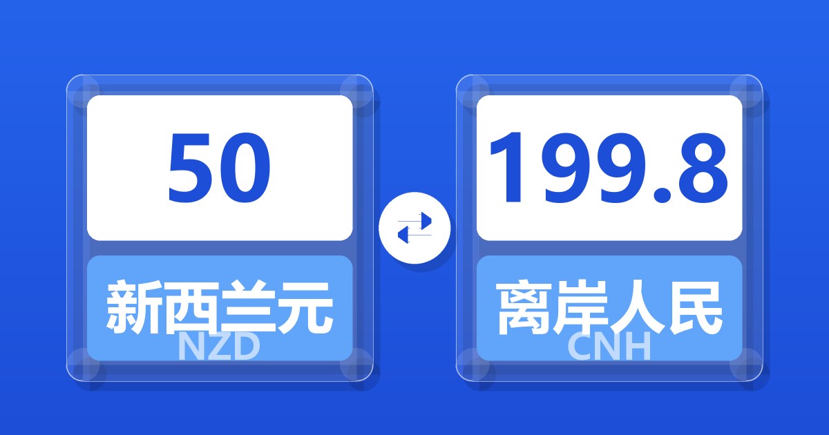 50 新西兰元 (NZD) = 199.02 离岸人民币 (CNH)