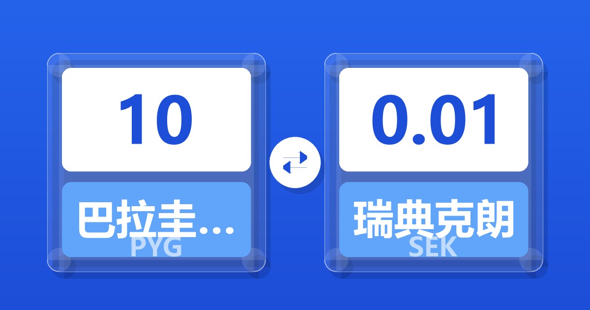 10 巴拉圭瓜拉尼 (PYG) = 0.01 瑞典克朗 (SEK)