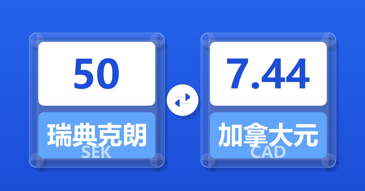 50 瑞典克朗 (SEK) = 7.44 加拿大元 (CAD)