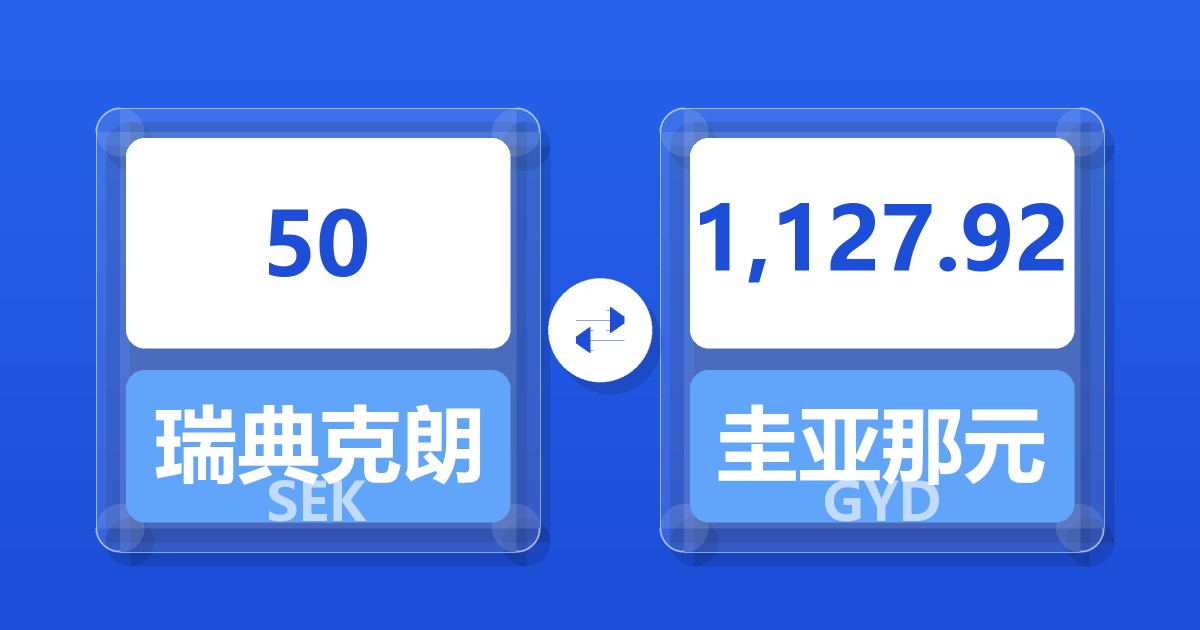 50 瑞典克朗 (SEK) = 1,127.04 圭亚那元 (GYD)