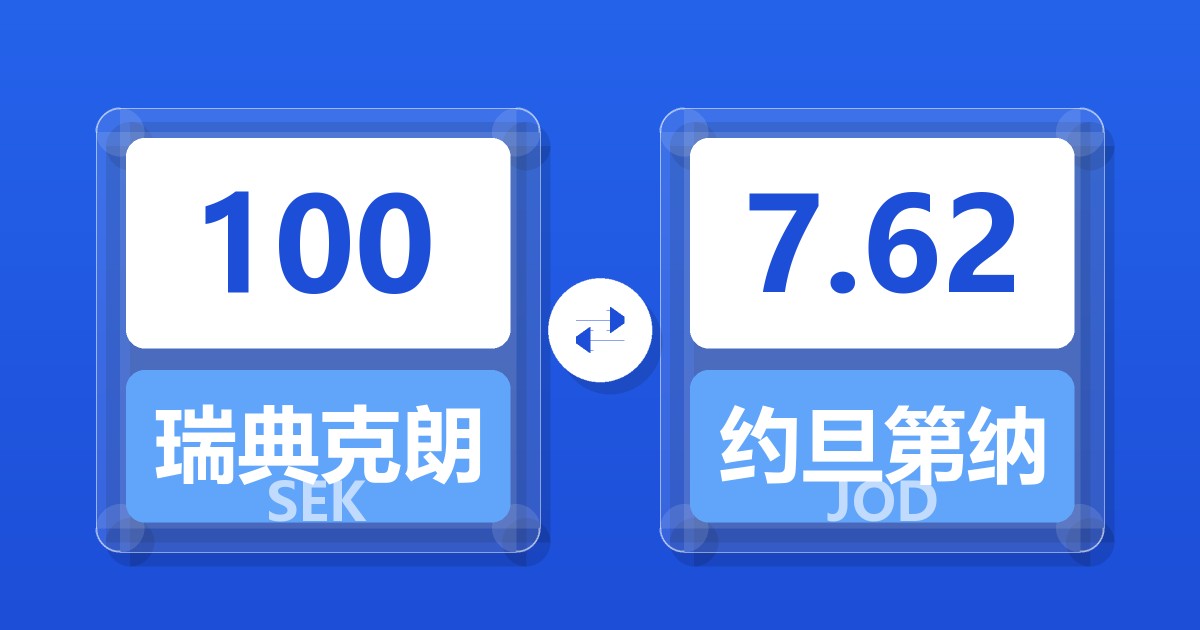 100 瑞典克朗 (SEK) = 7.62 约旦第纳尔 (JOD)