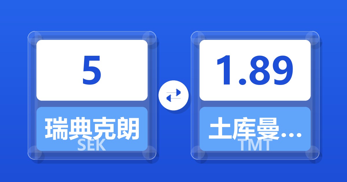 5 瑞典克朗 (SEK) = 1.88 土库曼斯坦马纳特 (TMT)