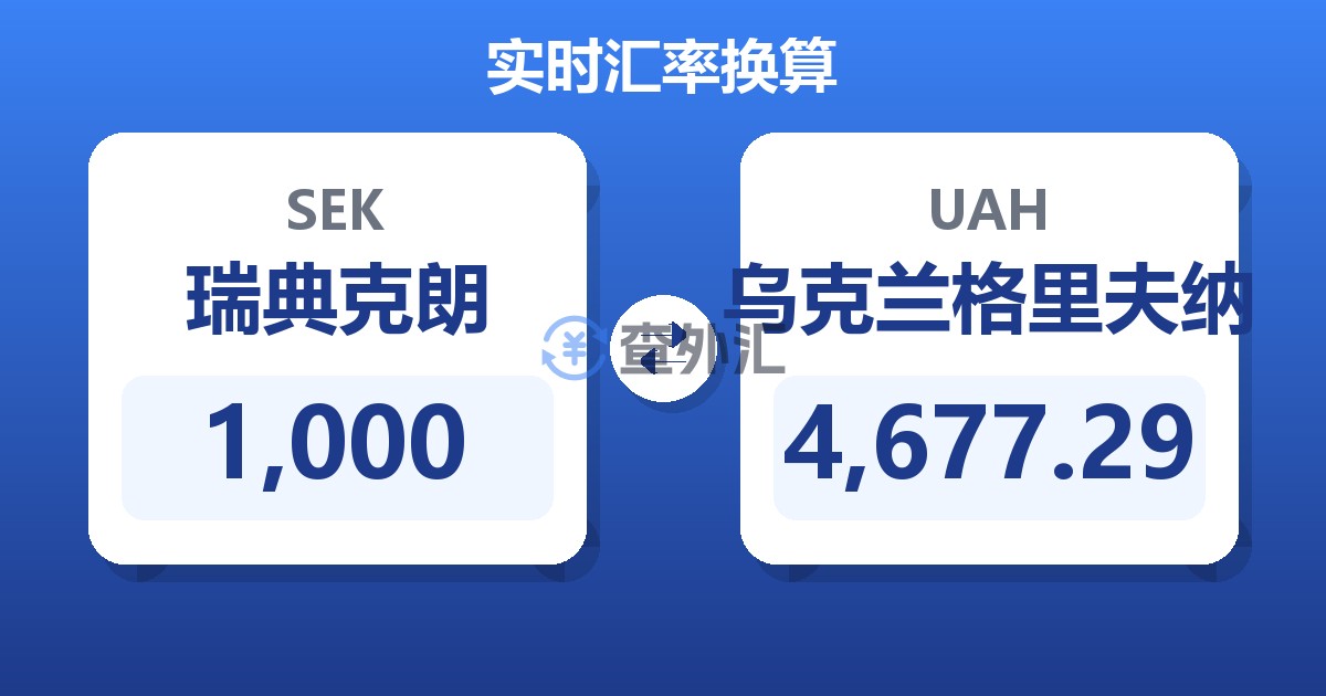 1,000 瑞典克朗 (SEK) = 4,663.76 乌克兰格里夫纳 (UAH)