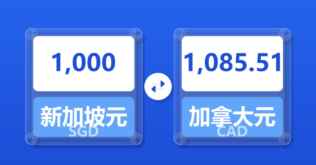 1,000 新加坡元 (SGD) = 1,086.81 加拿大元 (CAD)