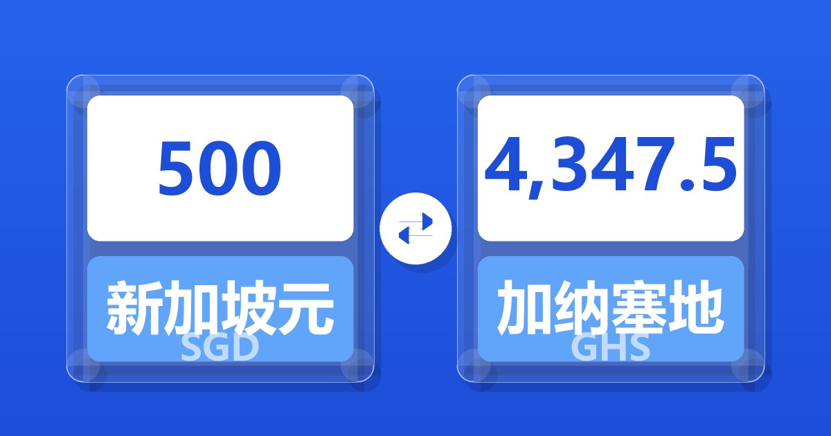 500 新加坡元 (SGD) = 4,347.50 加纳塞地 (GHS)