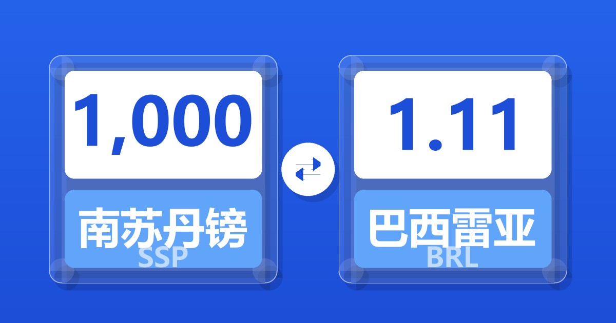 1,000 南苏丹镑 (SSP) = 1.11 巴西雷亚尔 (BRL)