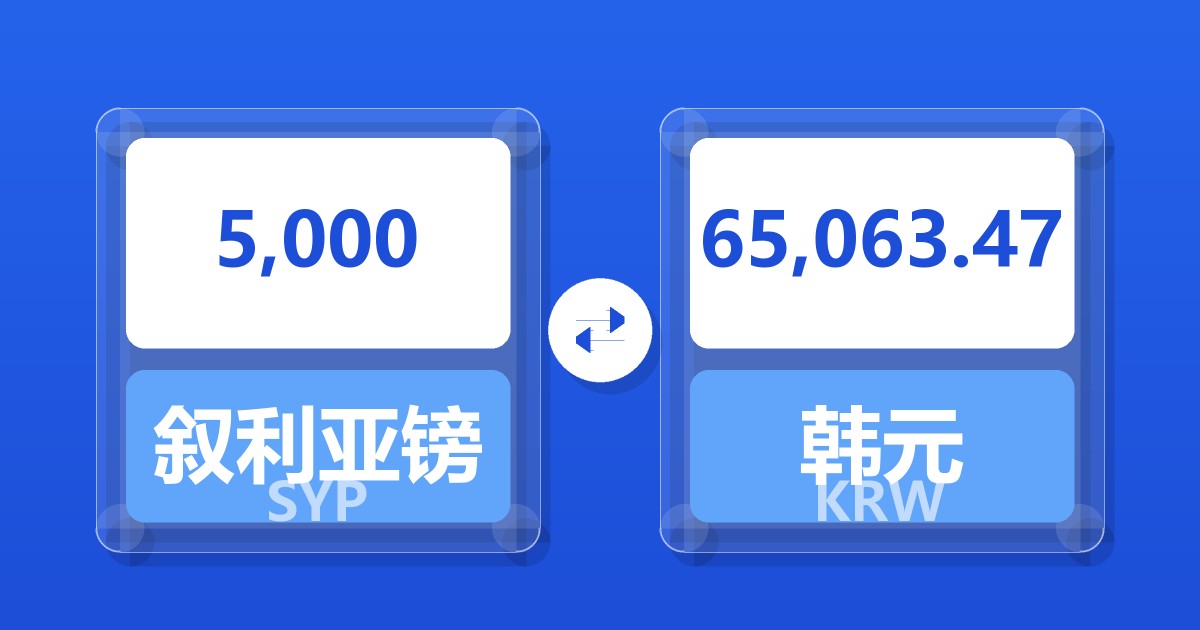 5,000 叙利亚镑 (SYP) = 65,063.47 韩元 (KRW)
