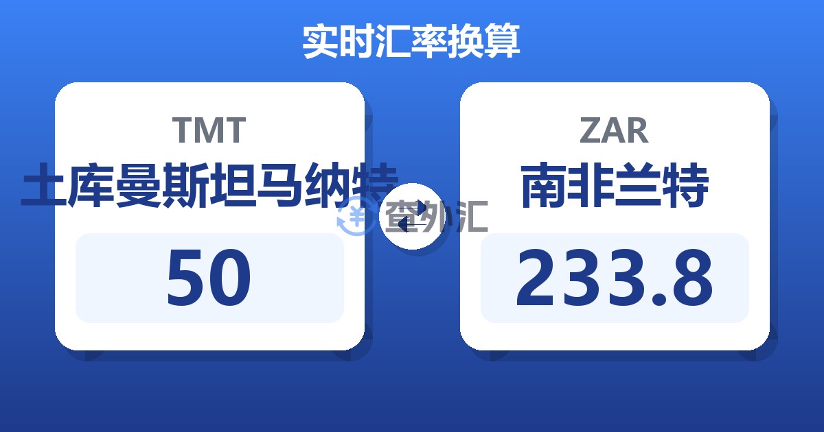 50 土库曼斯坦马纳特 (TMT) = 233.86 南非兰特 (ZAR)