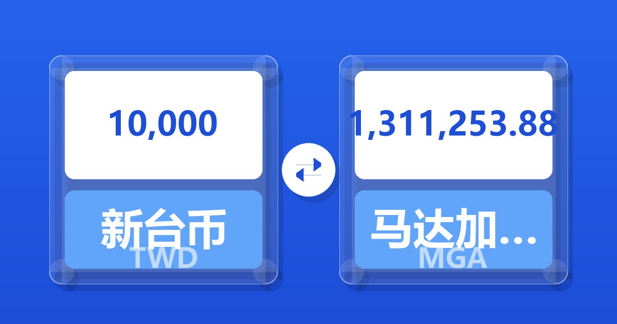 10,000 新台币 (TWD) = 1,311,253.88 马达加斯加阿里亚里 (MGA)