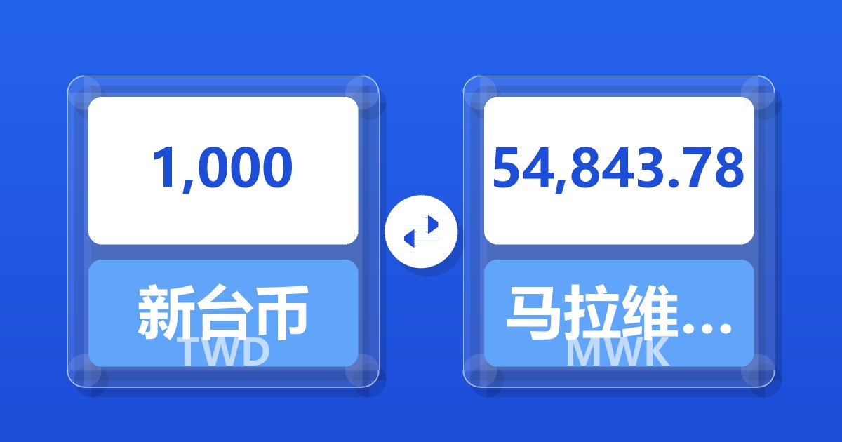 1,000 新台币 (TWD) = 54,843.78 马拉维克瓦查 (MWK)