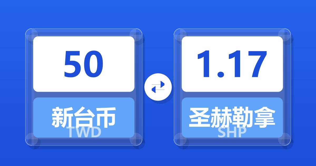 50 新台币 (TWD) = 1.17 圣赫勒拿镑 (SHP)