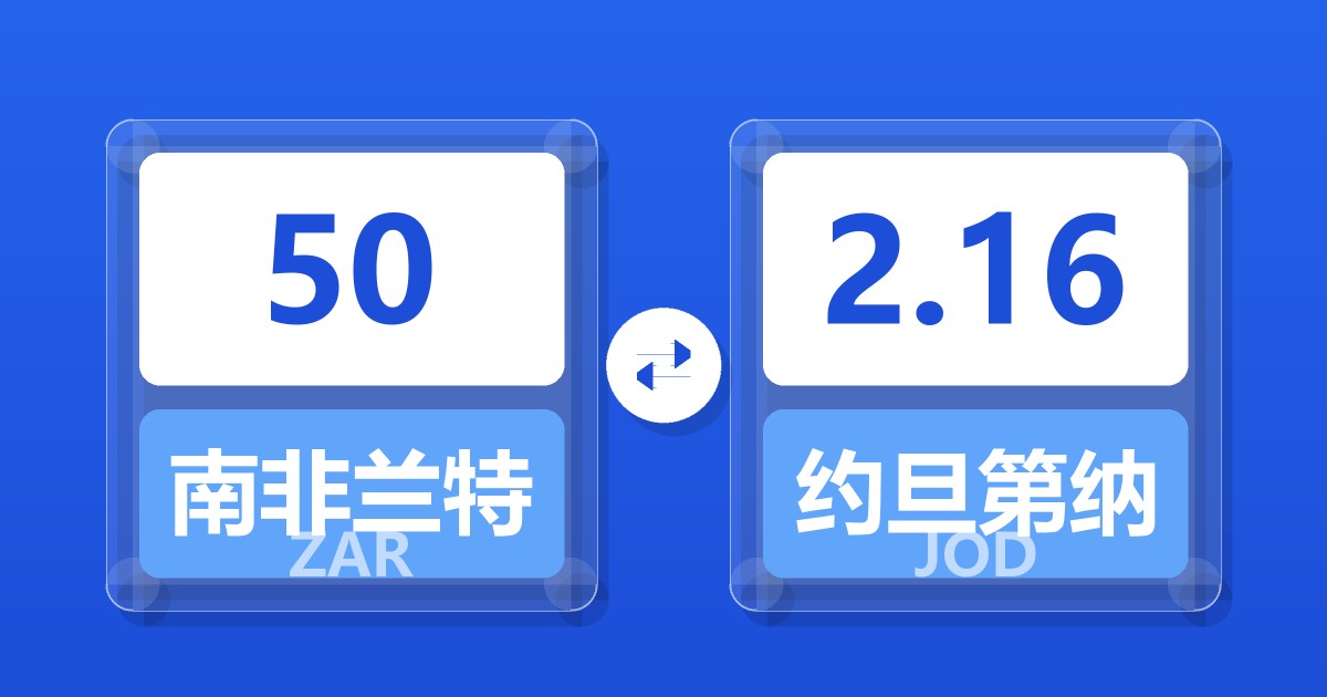 50 南非兰特 (ZAR) = 2.16 约旦第纳尔 (JOD)