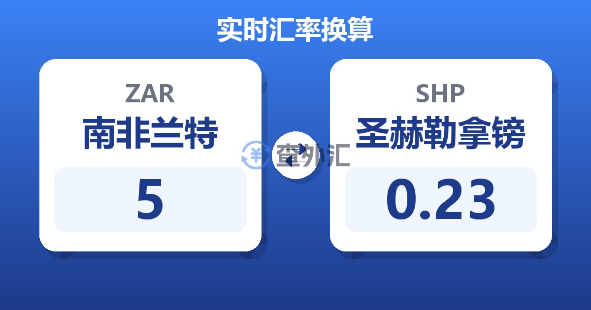5 南非兰特 (ZAR) = 0.23 圣赫勒拿镑 (SHP)